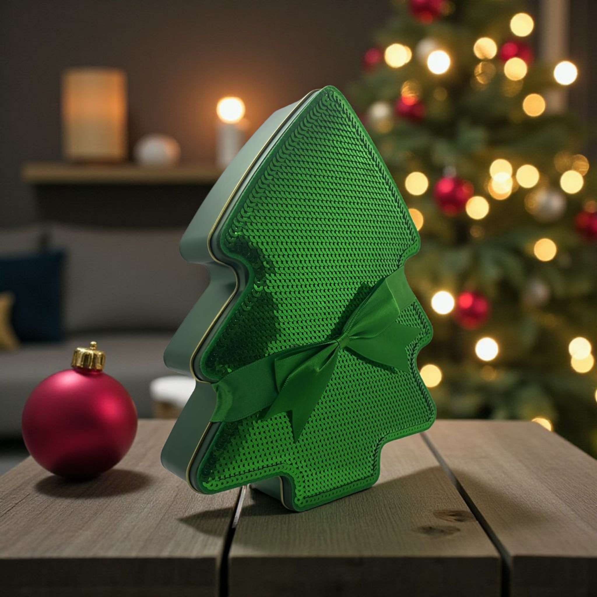 Die hochwertige Tannenbaumdose mit grünen Pailletten und eleganter Schleife ist ein echter Hingucker – ob als Geschenk oder als festlicher Begleiter auf dem Schreibtisch.